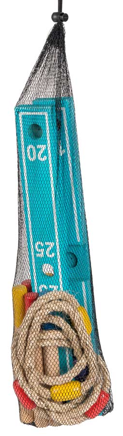 Ringspil i træ der kommer med ringe som er fremstillet i kraftigt reb. Ringspillet er solidt fremstillet i FSE træ og kommer i flotte farver. Hver pind er tydeligt markeret med farver. Få en sjov sommer i haven med dette flotte ringspil i træ.