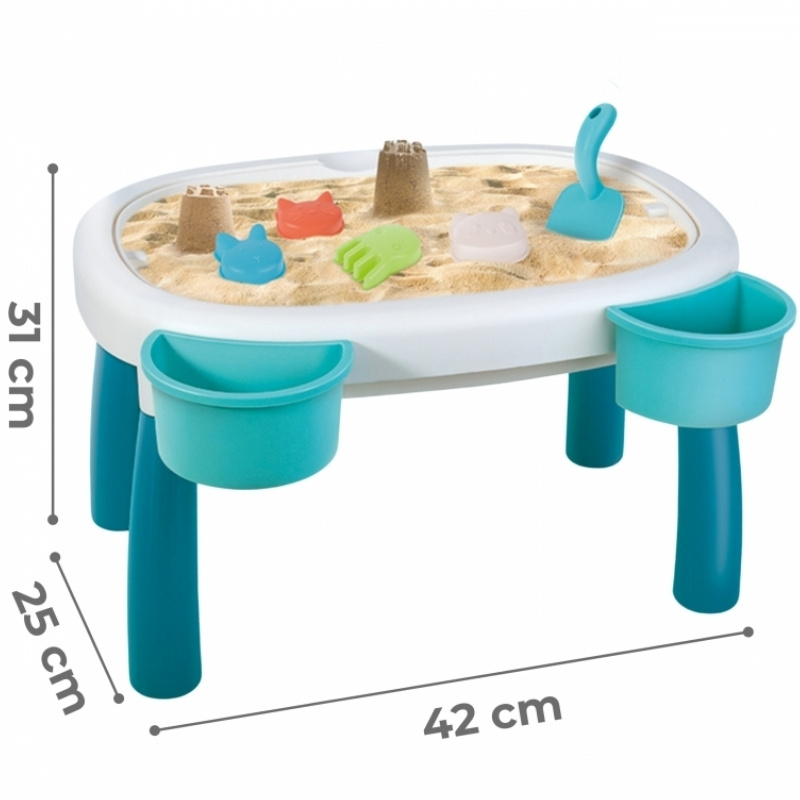 Bordet har en stabil konstruktion og er let at samle. De medfølgende forme og tilbehør giver mange timers kreativ leg, hvor børn kan hælde, bygge og eksperimentere med vand og sand.