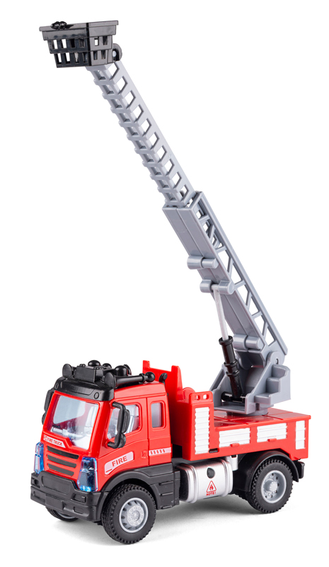 Sej lille Speed Car Construction brandbil med pull back funktion som sikrer at den selv farer hen over gulvet når barnet slipper den fri. Brandbilen er lavet i plast og har en stige som kan udvides og dreje rundt.