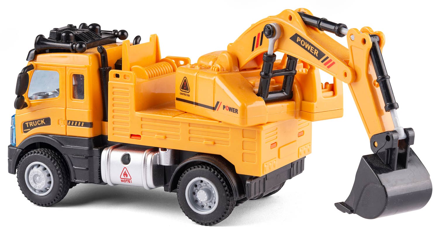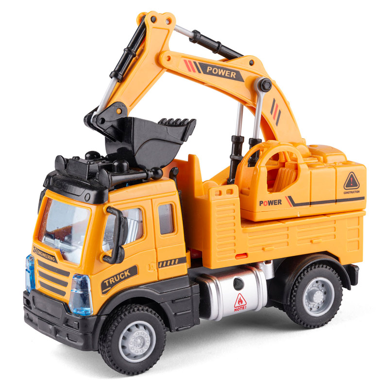 Sej lille Speed Car Construction lastbil med pull back funktion som sikrer at den selv farer hen over gulvet når barnet slipper den fri. Lastbilen er lavet i plast og har en gravko med skovl på ladet som kan dreje rundt.