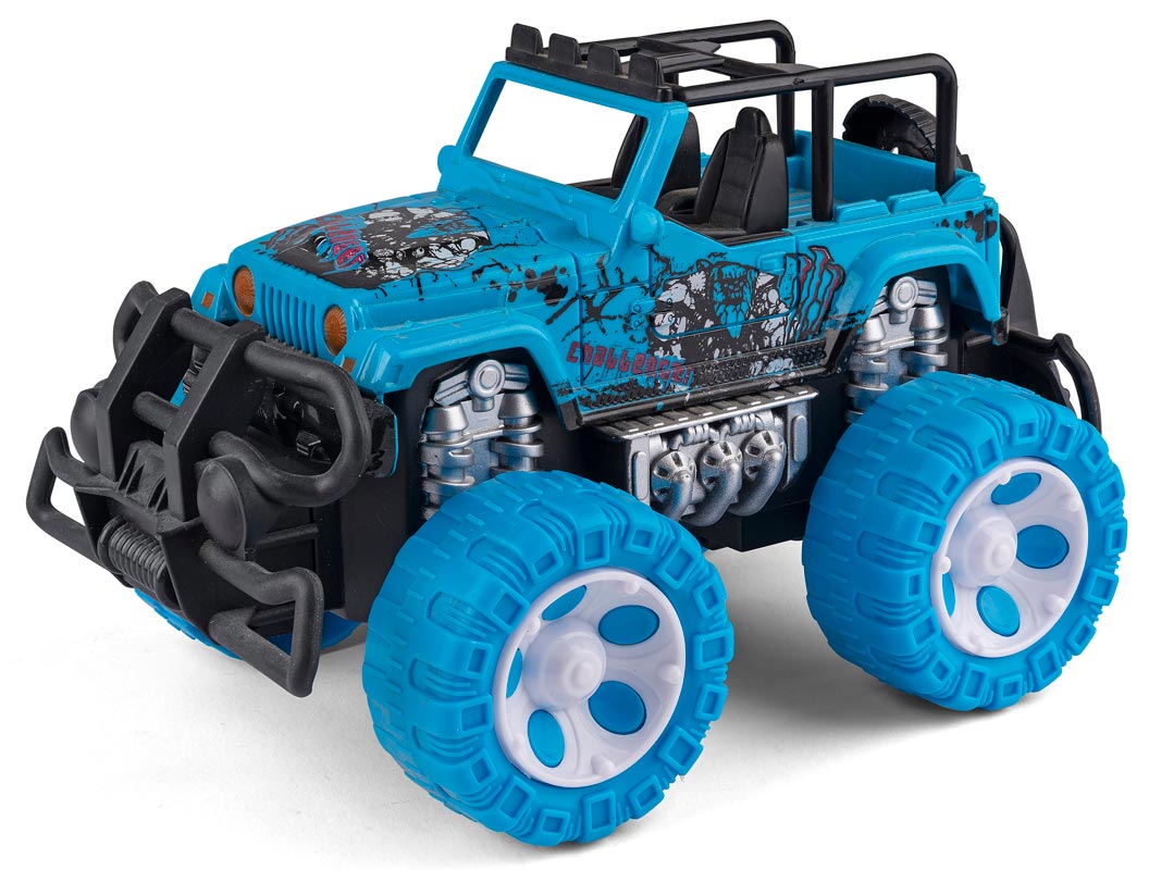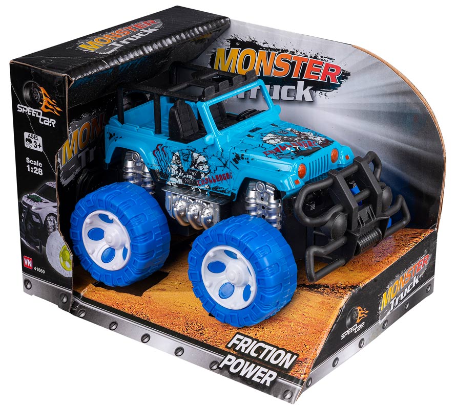 Nu skal der køres ræs. Denne seje moster truck har en kraftig friktionsmotor som kan få bilen til at fræse henover gulvet når den skubbes fremad. Monster trucken måler ca. 19 x 14 cm og er lavet i størrelsesforholdet 1:28.