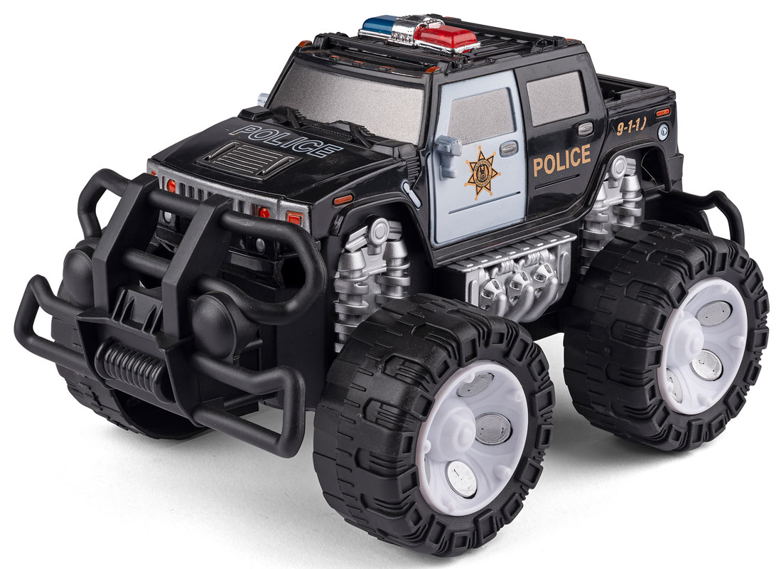 Nu skal der køres ræs. Denne seje politi moster truck har en kraftig friktionsmotor som kan få bilen til at fræse henover gulvet når den skubbes fremad. Monster trucken måler ca. 19 x 14 cm og er lavet i størrelsesforholdet 1:28.
